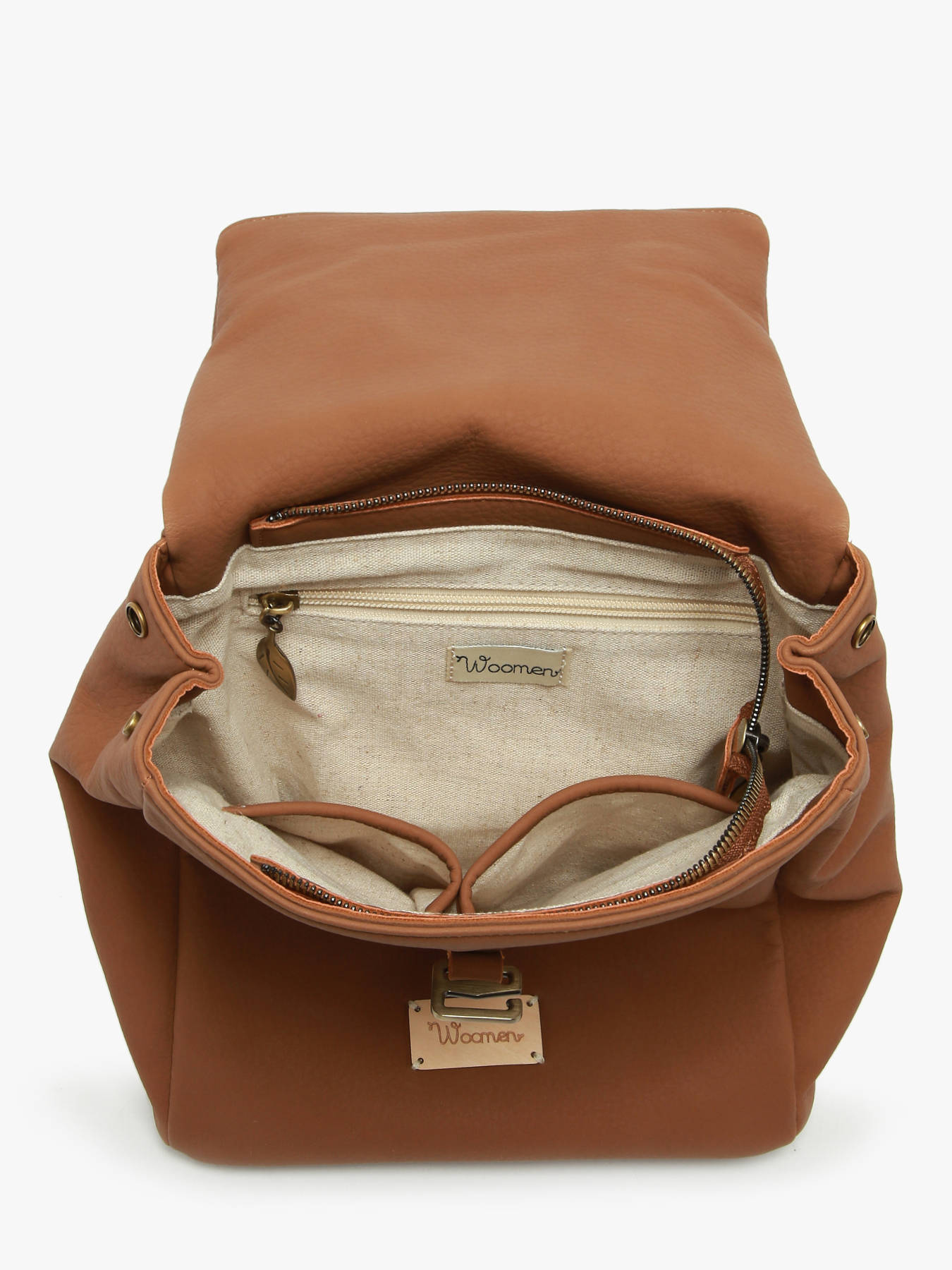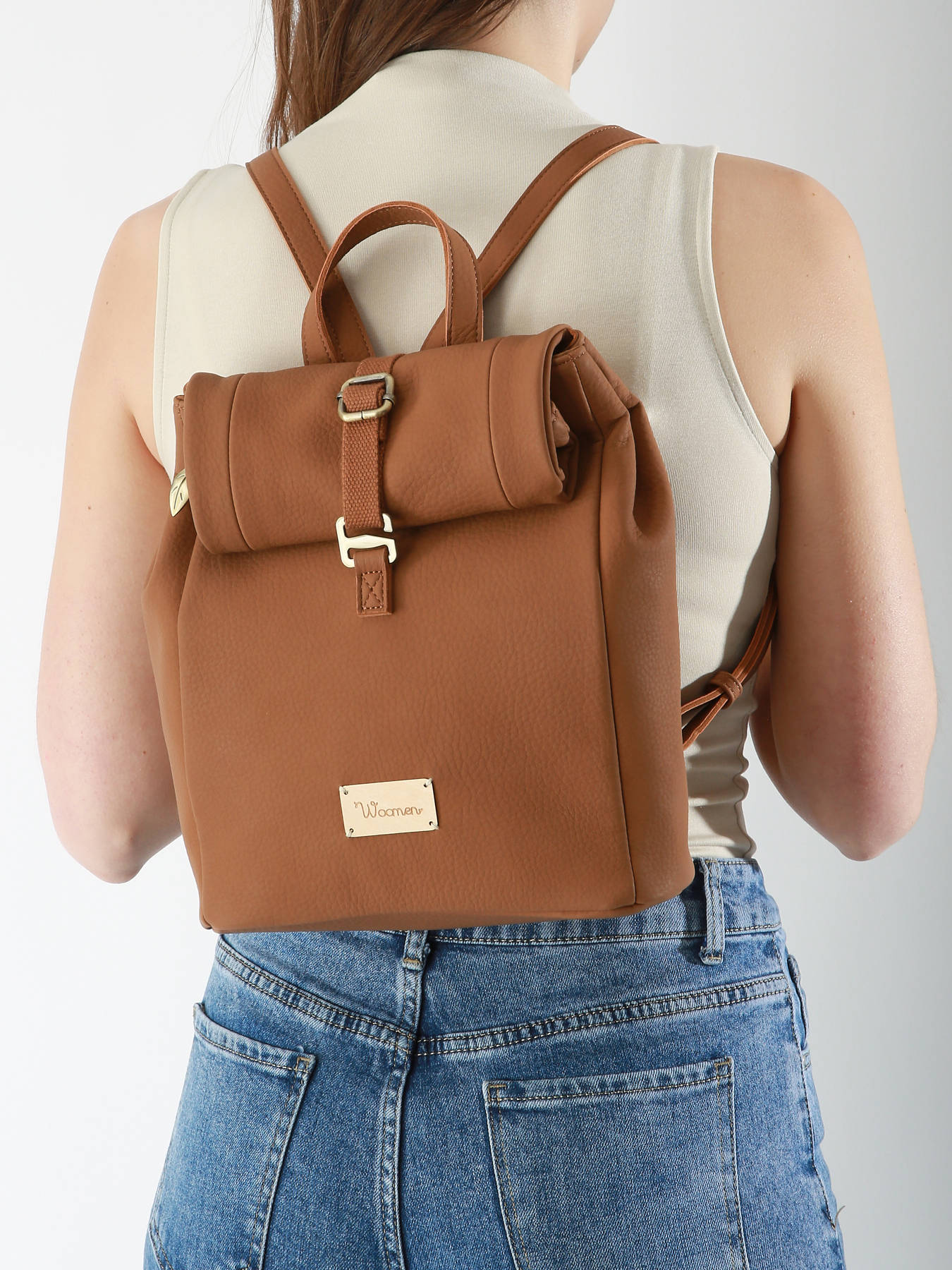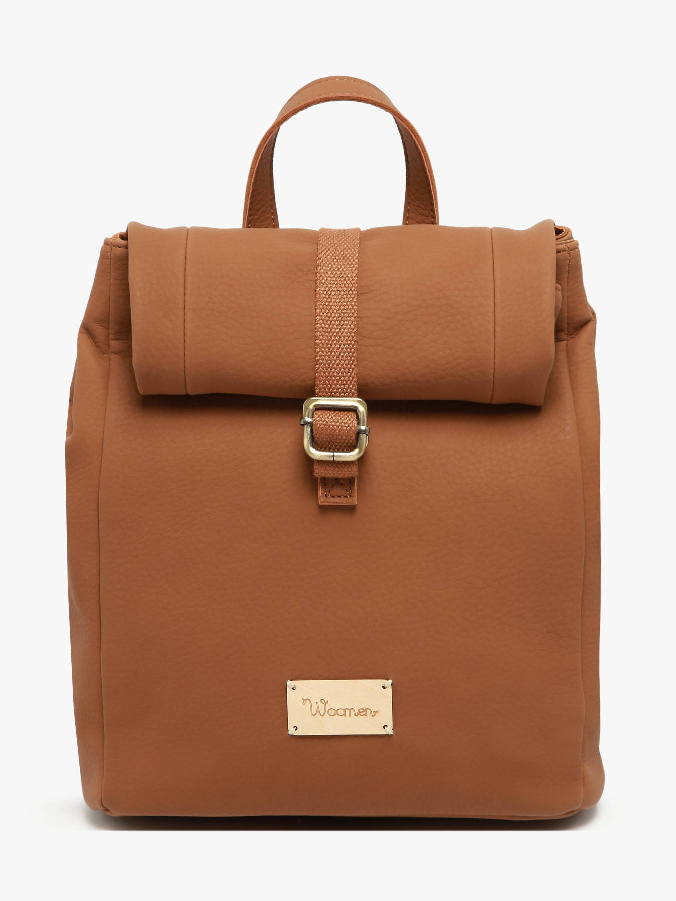 The WOOMEN backpack from the MUSCARI line, made of recycled polyurethane with a cotton and linen lining, features a new rolltop design. Compact and urban, it can be carried by hand or on the back with adjustable straps. It includes a single compartment, two simple pockets, a quick-access pocket, and a back pocket. Its closure combines a zip, flap, and clasp for added security.