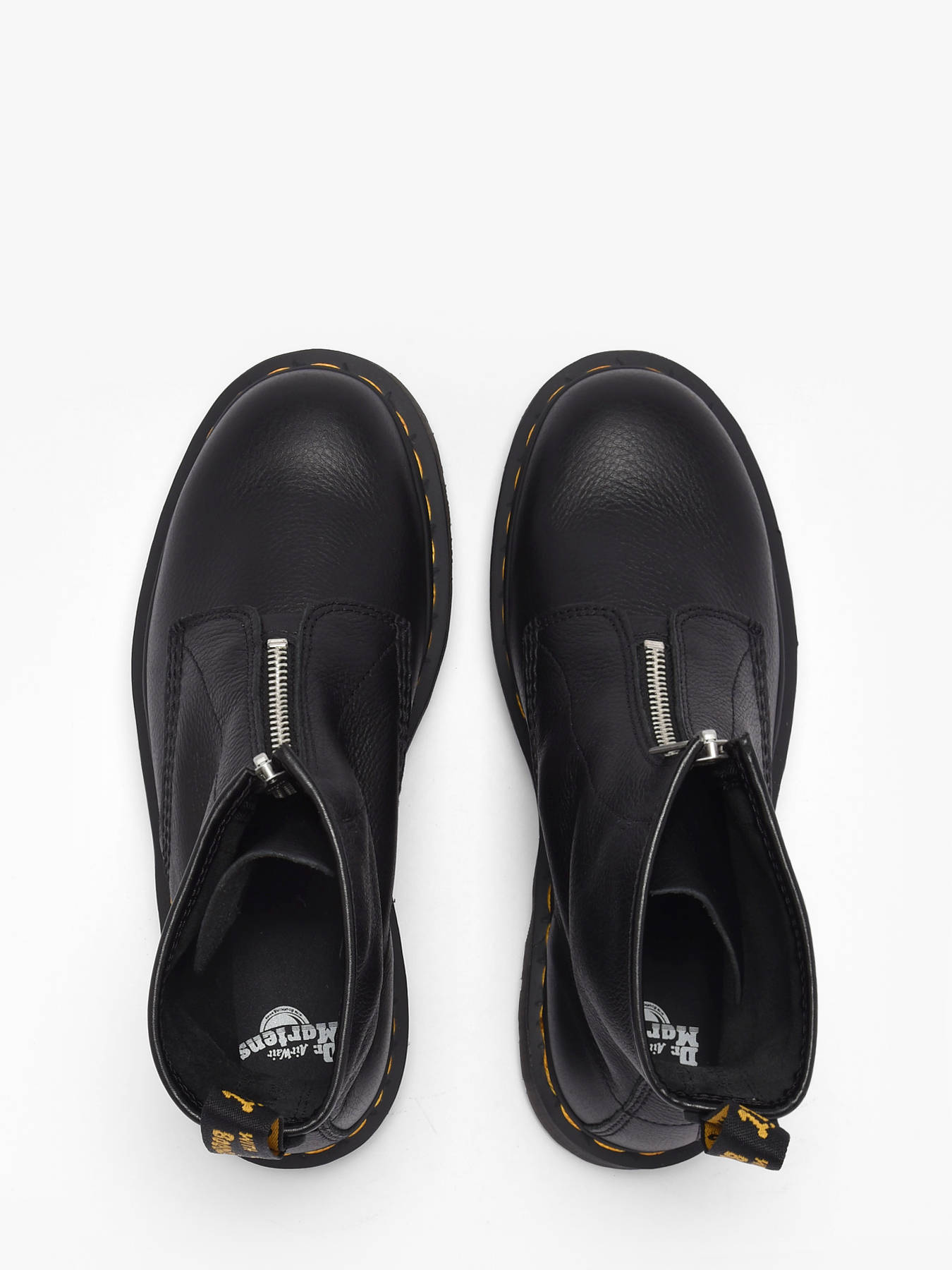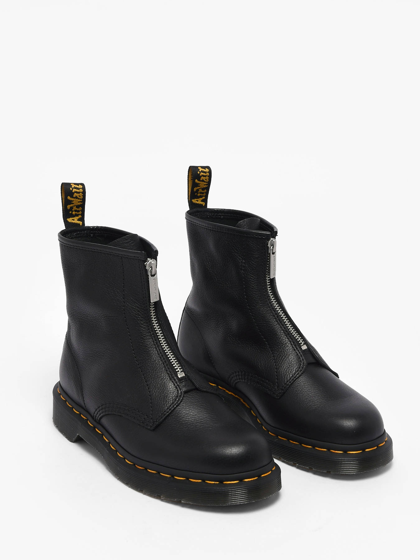 The 1460 boots from Dr Martens in black Virginia leather reinvent an icon with a contemporary twist and ultimate comfort. Their soft, fine-grain leather wraps the foot with supple ease, while the signature yellow stitching and heel loop celebrate six decades of Dr Martens heritage. The front zipper replaces traditional laces for easy on and off while maintaining the model’s iconic look. Resting on the classic Doc’s sole, durable and timeless, these boots combine strength and legendary style. Versatile and bold, they are a must-have to carry the season with confidence, comfort, and the unmistakable rebellious, rock identity of Dr Martens.