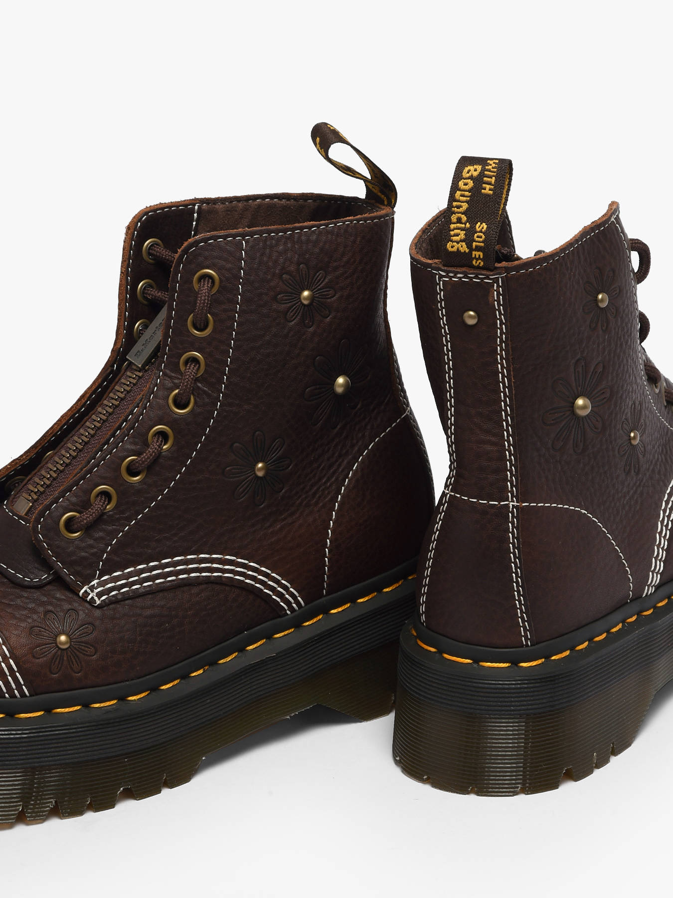 The Sinclair Flower platform boots from Dr Martens in dark brown Grizzly leather combine boldness, style, and character for a unique look. Their thick leather with a subtle grained finish develops a distinct patina over time, while the removable top zipper allows for personalized wear. Dark brown rope laces, aged gold finishes, and embossed floral details highlighted with gold studs add contrast and playfulness without sacrificing durability or comfort. Resting on an iconic platform sole with yellow stitching and a two-tone pull-loop, these boots merge strength and style, becoming a must-have to carry the season with boldness, mischievous spirit, and Dr Martens’ signature rock identity.