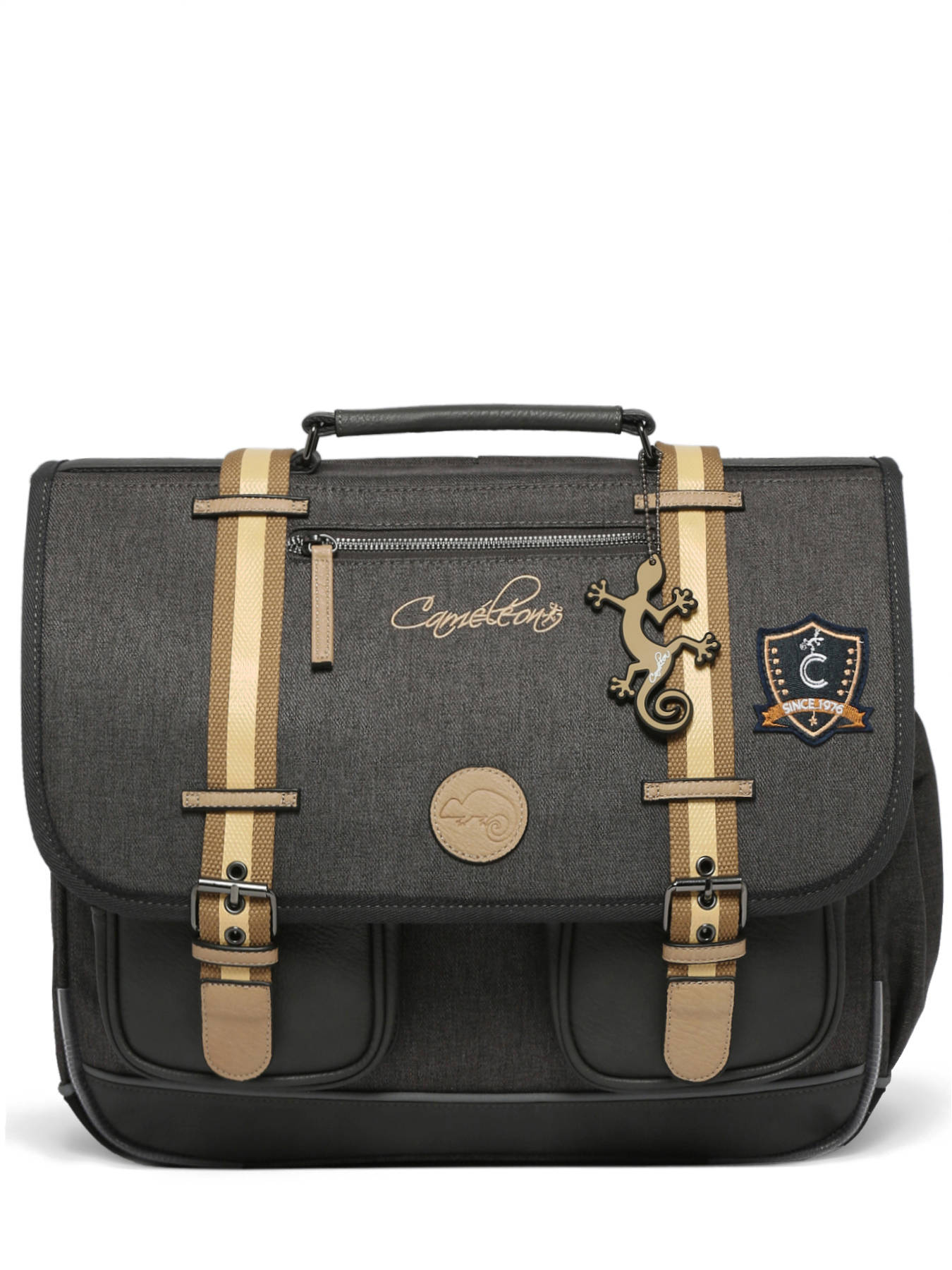 41 cm - 24 litres - 1.33 kg ~ Cartable enfant primaire 41 cm signé Caméléon de la ligne Vintage Urban. Ce cartable enfant convient parfaitement pour le CM1 et le CM2. Il se divise en trois grands compartiments pour l'ensemble des affaires d'école. Fonctionnel, il dispose d'un emplacement spécial gourde et de trois poches à fermeture éclair sur le devant du cartable. Petit plus, ce cartable dispose d'une étiquette nom. Ergonomique, la poignée et le fond du cartable sont renforcés. Très confortable, le dos et les bretelles sont rembourrés. Ce cartable est fabriqué en polyester recyclé imperméable. Côté sécurité, des bandes réfléchissantes sont disposées autour du cartable enfant. Petit plus, une règle est offerte !