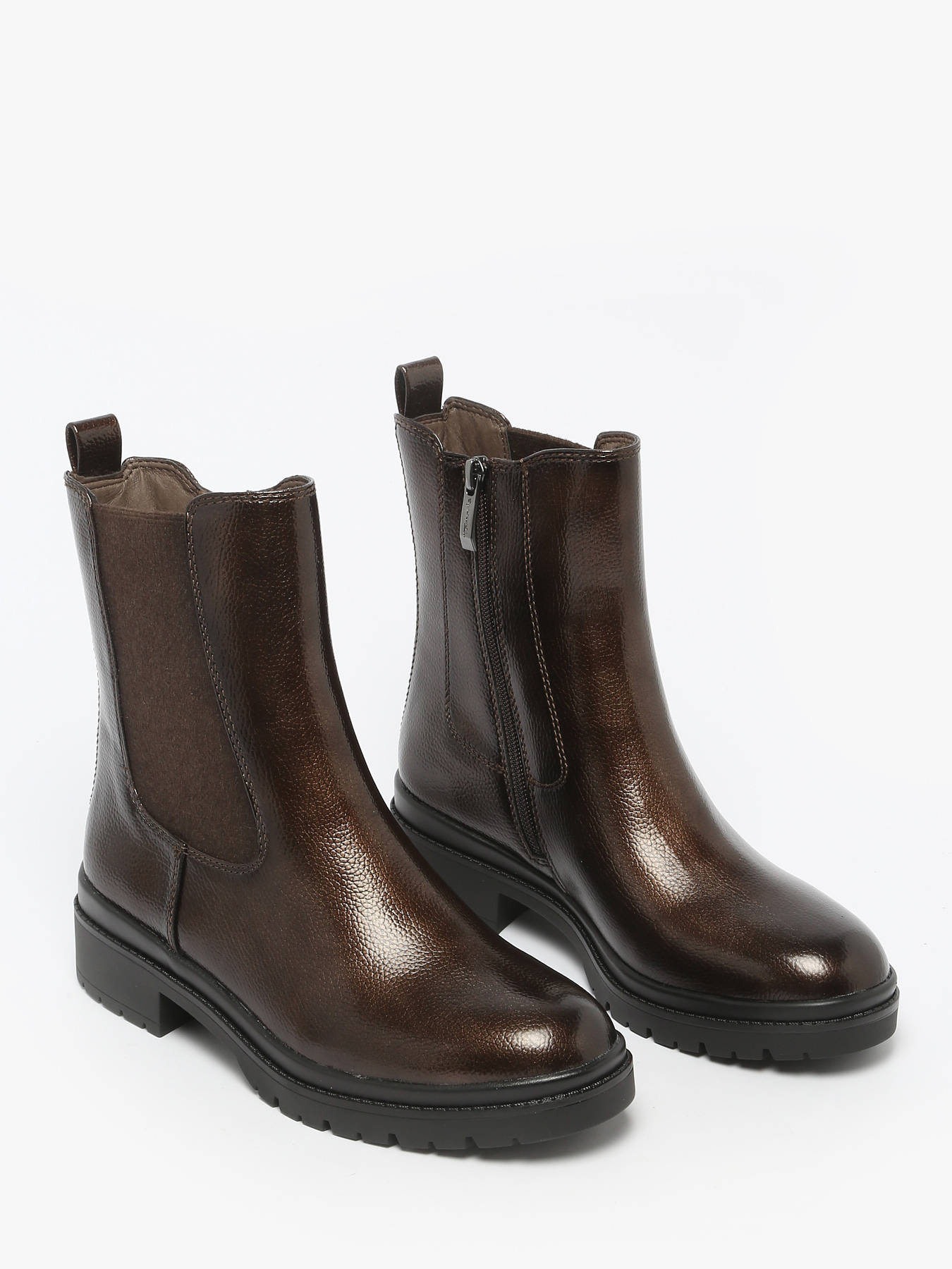 Ready to showcase your unique style, shine in these Tamaris Chelsea boots in patent brown, featuring a 4.5 cm platform and structured sole for confident steps all day long. The convenient zip and elastic panels make slipping them on effortless each morning, while the Touchit padding and removable insole provide optimal comfort at the office or on urban strolls. Embrace your strength, elevate your chic urban look, and turn every day into a moment of elegance, style, and well-being. Step confidently and let these Tamaris Chelsea boots perfectly complement your modern, sophisticated appearance.