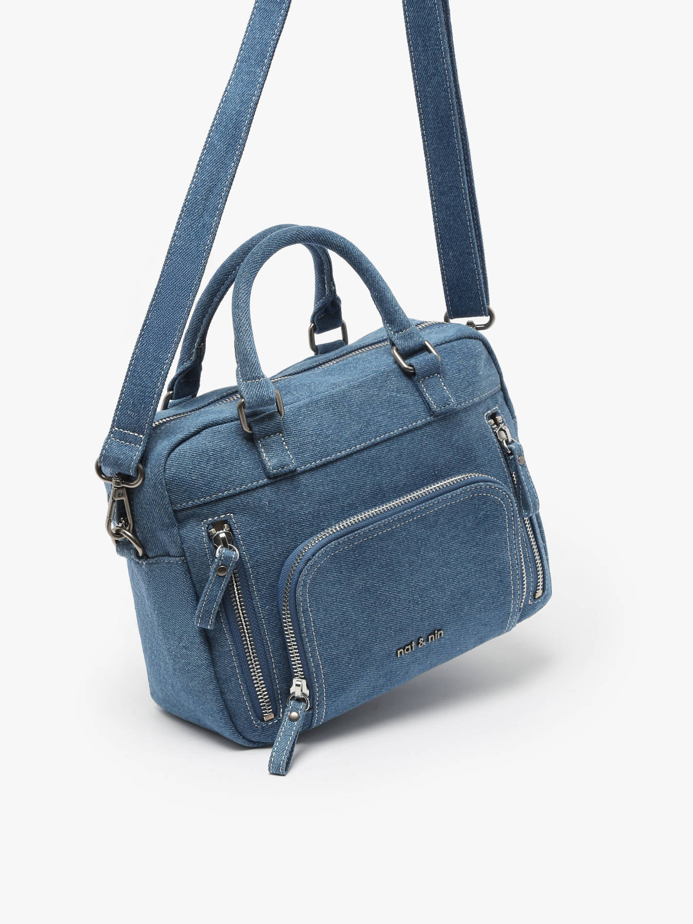 The NAT ET NIN crossbody bag in cotton offers the perfect combination of practicality and style. On the outside, it features three front pockets and one back pocket, allowing quick access to your essential items. Its zip closure ensures the security of your belongings. The adjustable, removable shoulder strap allows you to carry it by hand or as a crossbody, depending on your preference. Inside, a spacious compartment, a slip pocket, and a zipped pocket provide optimal organization. A chic and functional accessory, ideal for everyday use.