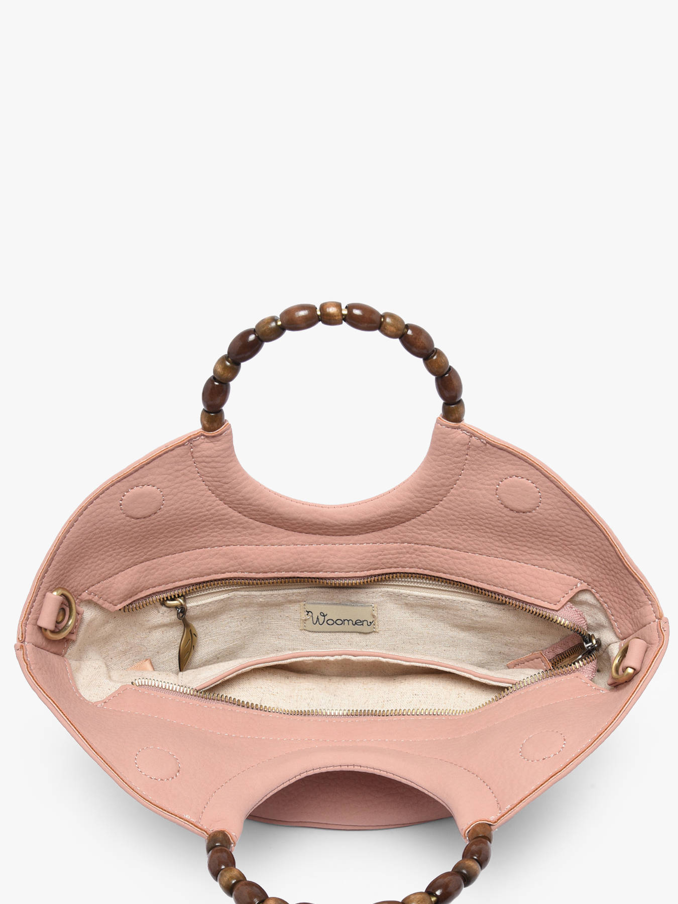 The small-format WOOMEN crossbody bag from the Neflier Pearl line combines elegance, practicality, and sustainable design. Its main material, polyurethane composed of 58% recycled materials, paired with a cotton and linen lining, ensures both lightness and durability. The wooden beaded handle adds originality and sophistication to the model. This bag features a zip closure, a zip pocket at the back, and a removable polyurethane strap for versatile wear, while inside, a zip pocket and a slip pocket keep your essentials organized. The gold-tone resin logo completes the design, elevating your outfits with a refined touch.