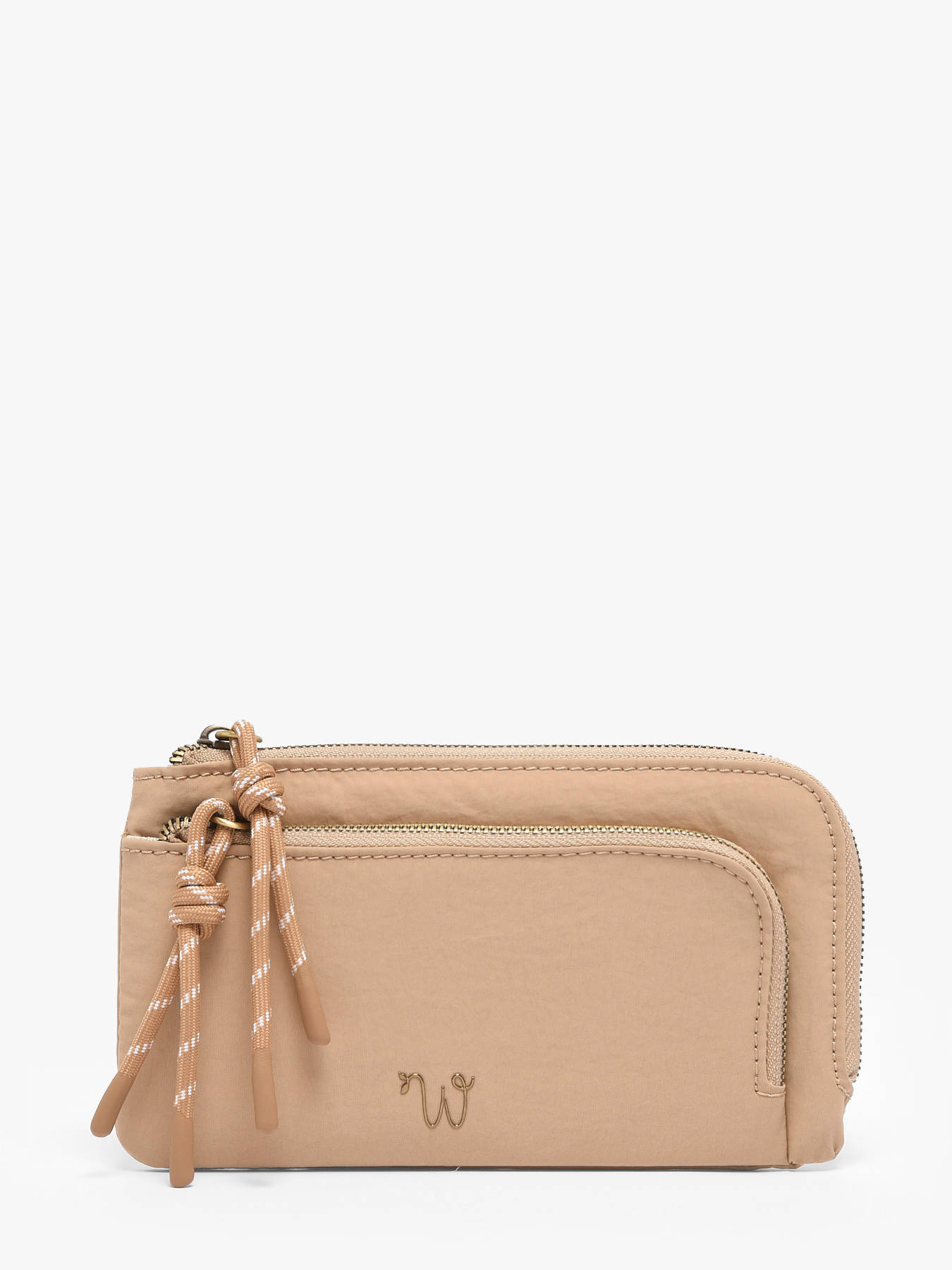 The WOOMEN Primevère wallet combines style, practicality, and sustainable design. Its main material, recycled nylon with a cotton and linen lining, ensures both lightness and durability. Decorative drawstrings and the distinctive logo add originality and sophistication to the model. It features two zip compartments to organize your essentials, while the gold-tone resin logo provides a refined finishing touch, making this wallet a practical, elegant accessory perfect for everyday use.
