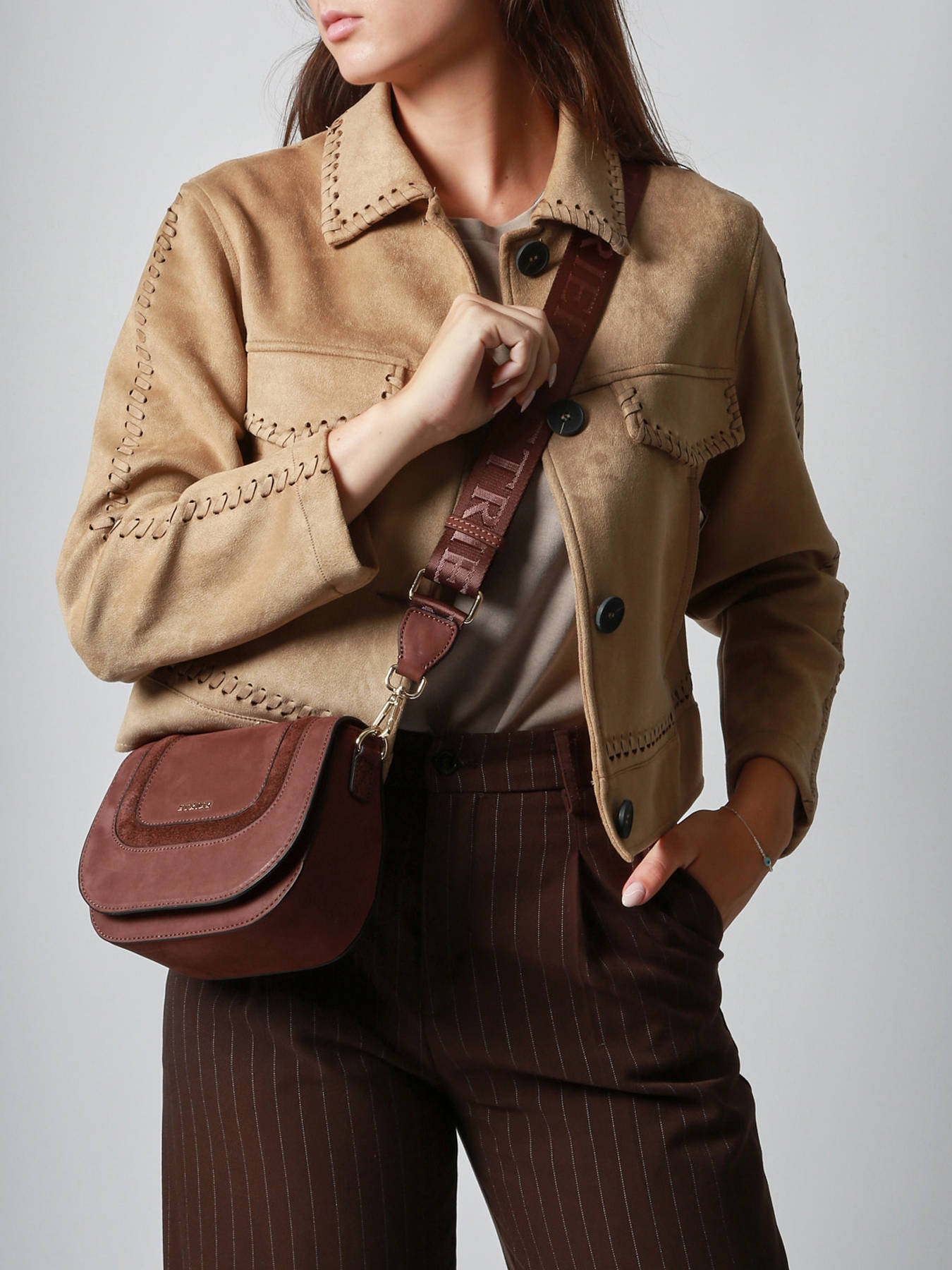 The ETRIER crossbody bag from the LASSO line, in a small S size, closes with a magnetic flap combined with a zipper. The LASSO line stands out with its two-tone design featuring rounded details, offering a beautiful contrast of textures in a more compact volume. The back of the bag is made of grained leather, ensuring durability and structure. Its sporty-chic shoulder strap, enhanced with the ETRIER hardware, gives a modern and refined look. This structured and elegant bag is perfect for adding character to more understated winter outfits.