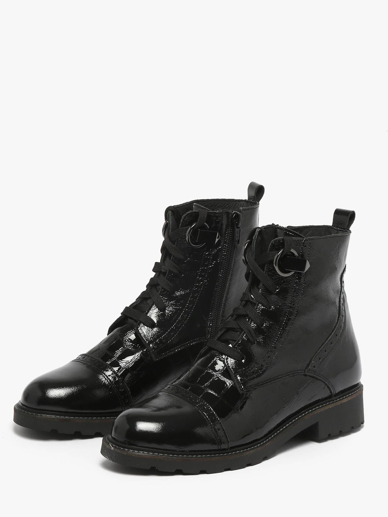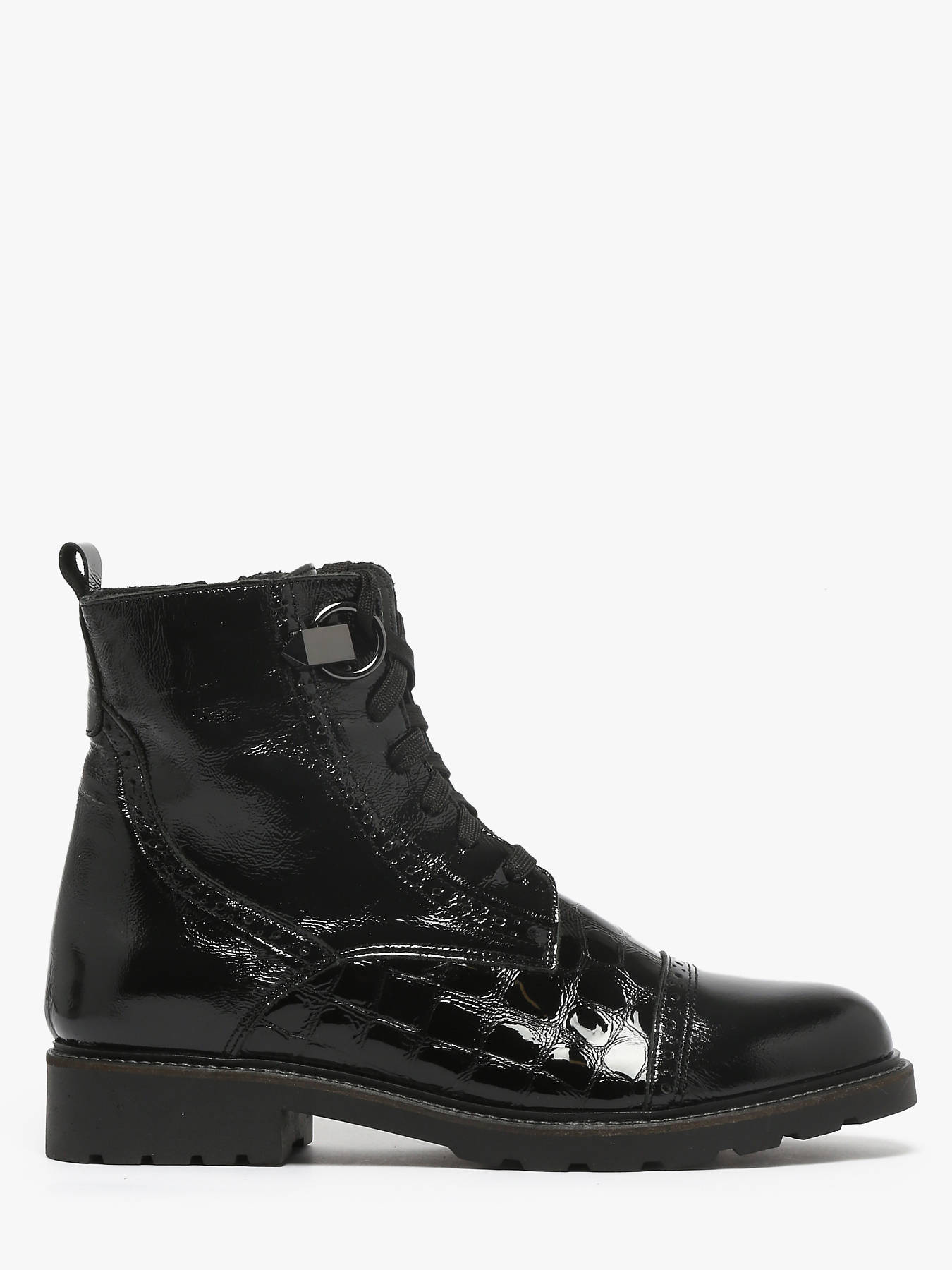 The black patent Croco ankle boots by MYMA combine boldness and sophistication. Crafted from patent leather with an elegant croco effect, they offer a polished, structured look. The mixed lace and zip closure ensures a perfect fit and easy wear, while the 3 cm ridged outsole provides comfort and stability. Fully leather-lined with a leather insole, they guarantee quality and durability. A chic, confident design, perfect for a modern urban style.