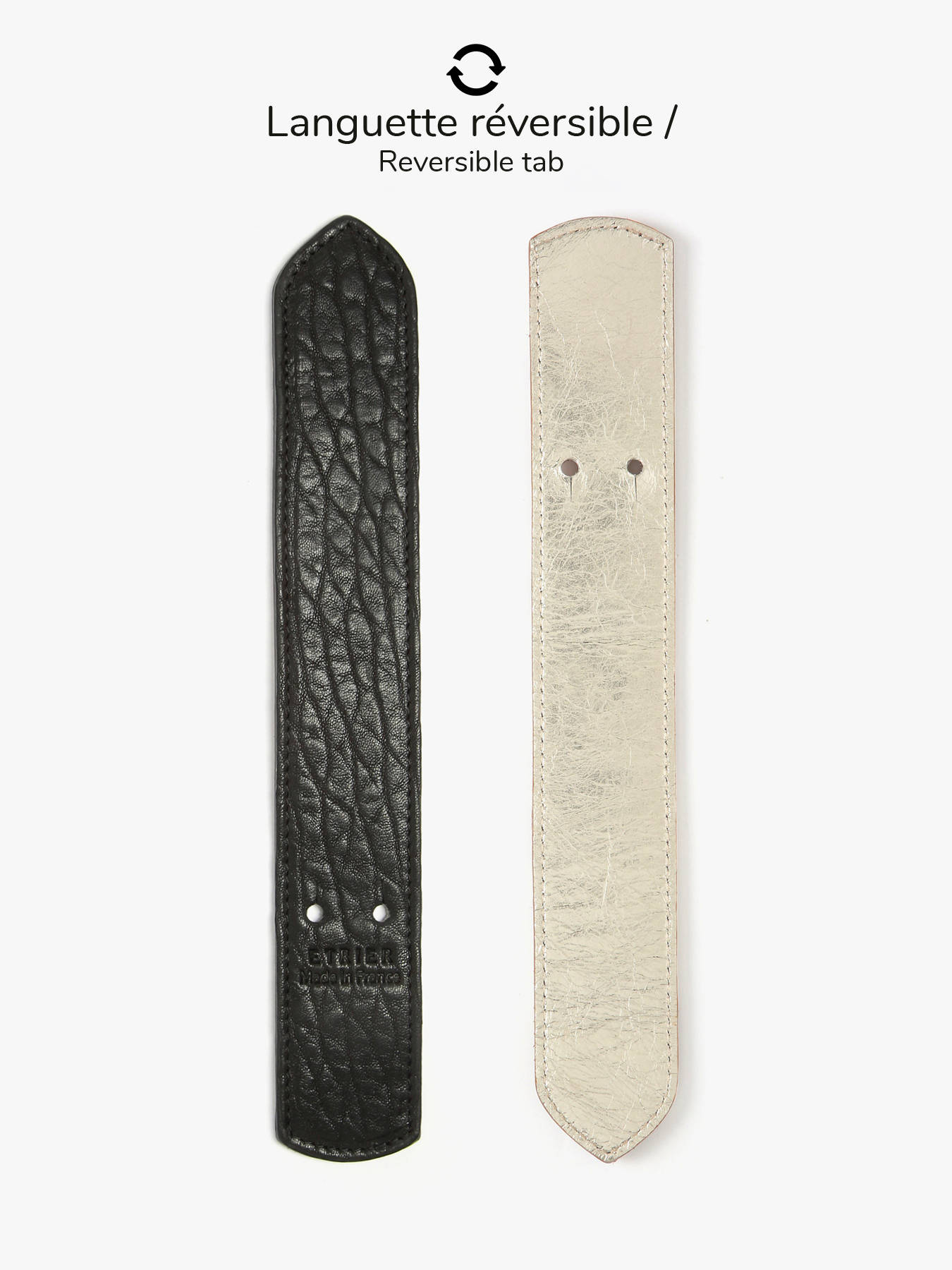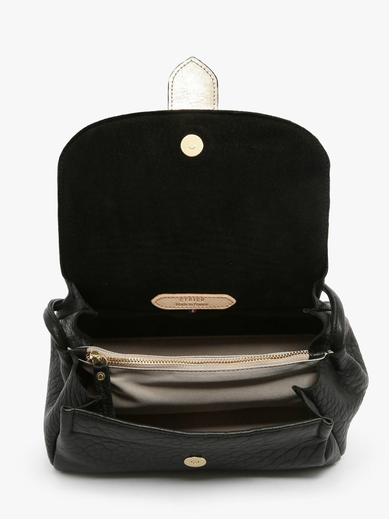 L'intérieur en cuir comprend trois compartiments, dont un central zippé, pour organiser aisément vos effets personnels. Le fond rigide du sac assure un maintien optimal. Le logo ETRIER, embossé sur du cuir naturel, est orné d'un petit drapeau français, apportant une touche élégante et distinctive.