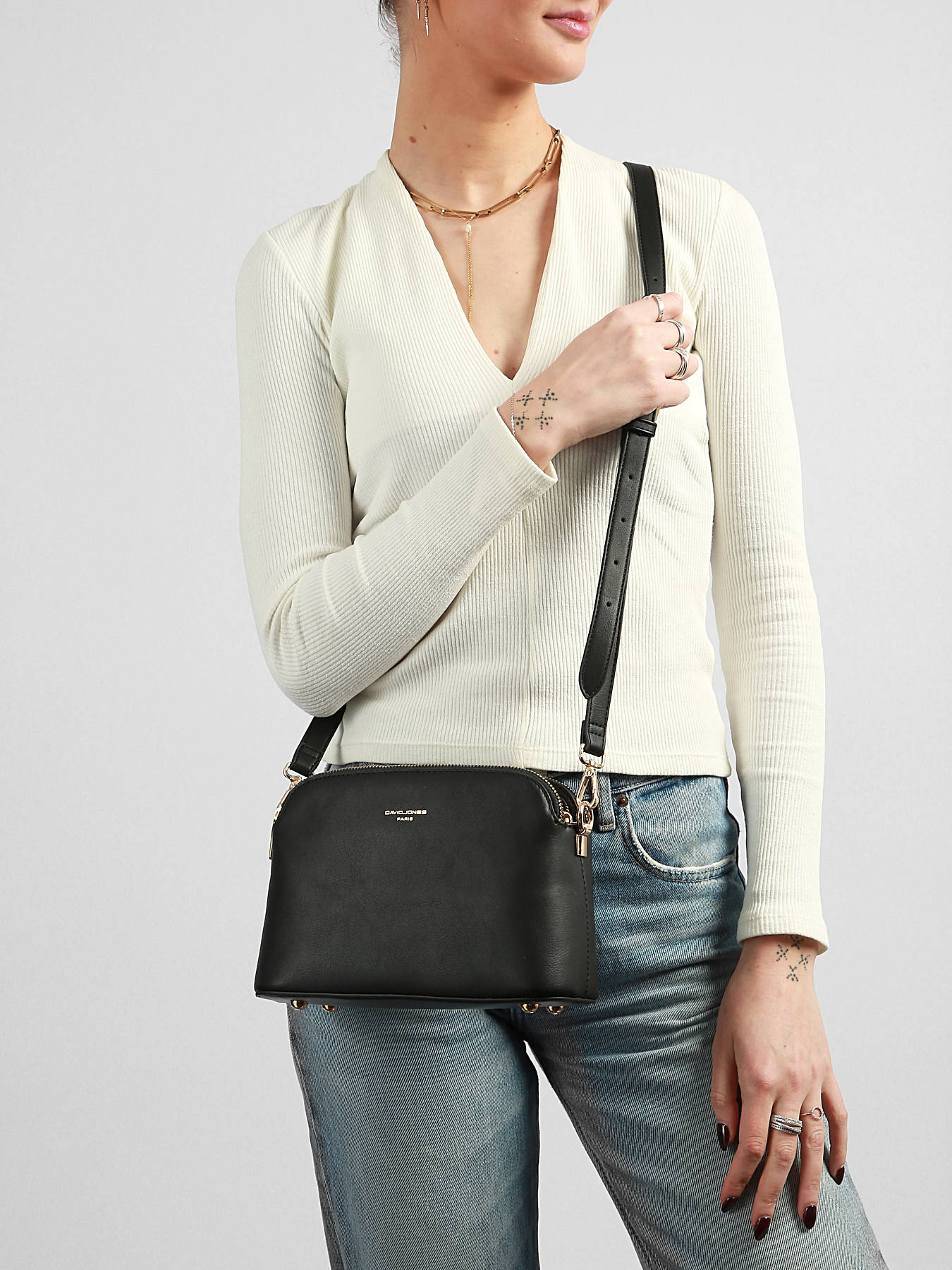 The DAVID JONES FRENCH Crossbody Bag combines urban elegance with optimal functionality. Crafted from high-quality PU, it features a smooth, durable texture perfect for daily use. Its zip closure secures your belongings while allowing quick access to essentials. The thoughtfully designed interior includes three compartments, one simple pocket, and one zip pocket, making it easy to organize cards, documents, phone, and small items. Versatile, it can be comfortably worn as a crossbody thanks to its adjustable and removable strap, providing a custom fit. Compact yet spacious enough for daily essentials, this bag blends practicality with modern design, perfect for city days or casual outings. With clean lines and refined finishes, it is a chic and functional accessory, essential in a contemporary wardrobe.