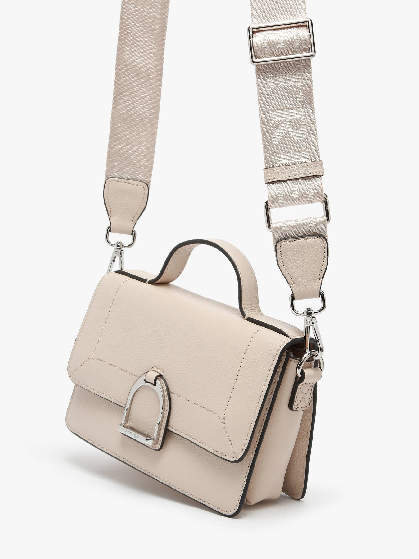 The ETRIER crossbody bag from the ALTESSE line, in a medium size, is crafted in cowhide leather. At the back, there is a flat pocket. It features a wide, removable canvas shoulder strap embroidered with the tonal ETRIER logo, as well as a leather handle. The flap closure, adorned with the iconic metal stirrup emblem of the house, secures with a press stud. Versatile, it can be worn over the shoulder or carried by hand. Inside, discover a leather key holder, a compartment with a flat pocket, and a zippered pocket for optimal organization. Available in various seasonal colors, as well as in larger and smaller sizes.
