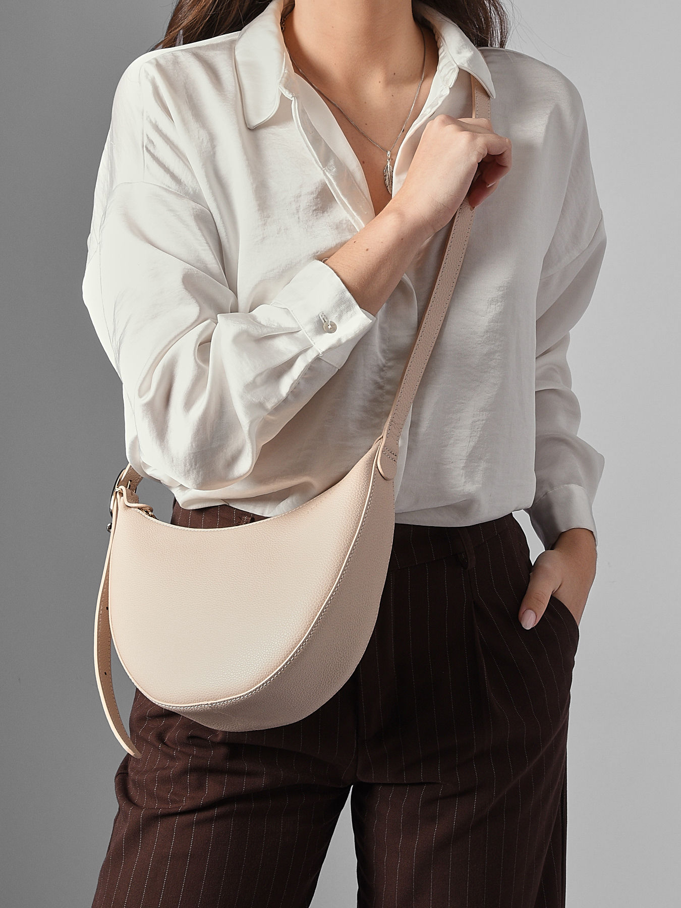 Le sac bandoulière S Le Foulonné LONGCHAMP, en cuir de vachette grainé, incarne douceur et féminité avec sa silhouette souple en demi-lune. Le grain emblématique du Foulonné reflète un style sobre et intemporel, traversant les époques avec élégance. Sa bandoulière permet un porté croisé, idéal pour un style décontracté au quotidien. Ce format moyen accueille aisément tous vos essentiels. Une boucle ardillon dorée pâle apporte une touche d’éclat, tandis qu’un mousqueton rond intégré permet d’accrocher vos grigris favoris. Le Foulonné, ligne emblématique de la Maison depuis plus de 40 ans, se distingue par ses courbes gracieuses et sa silhouette arrondie et souple. Décliné en plusieurs coloris neutres et intemporels, ce sac conserve son grain signature, reflet d’un style sobre et indémodable. Inspirée par les étriers, la boucle ardillon sublime la anse et met en valeur la beauté du cuir de vachette.